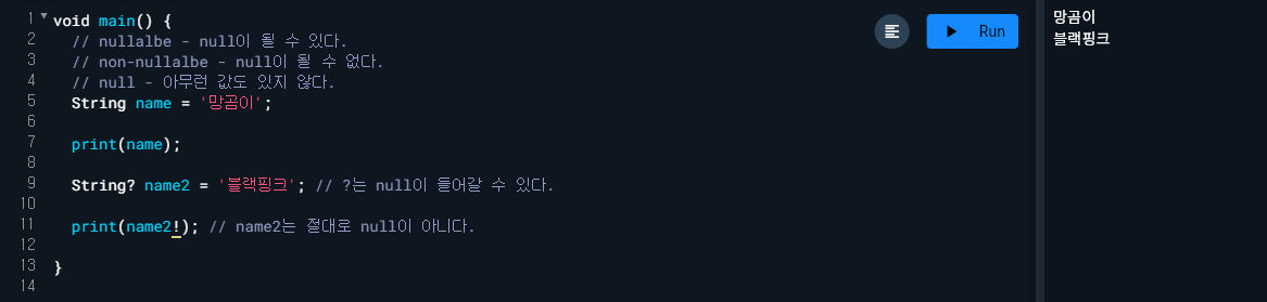 - 모든 타입은 타입만 들어갈 수 있는 경우, 타입과 null까지 들어갈 수 있는 경우로 나뉜다