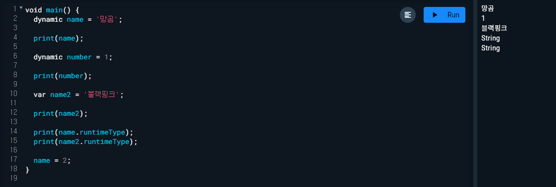 - dynamic 타입은 중간에 다른 타입으로 변경이 가능