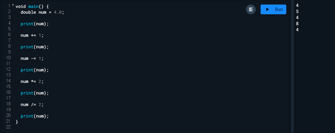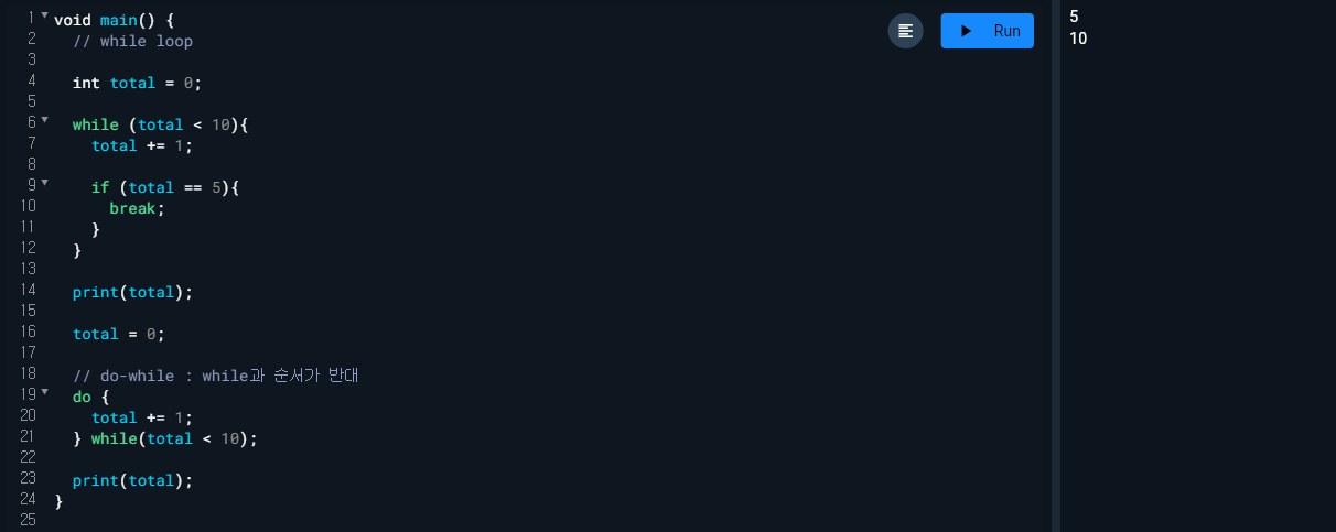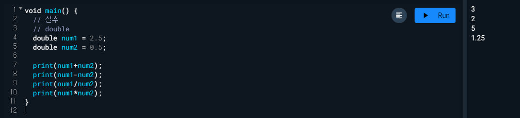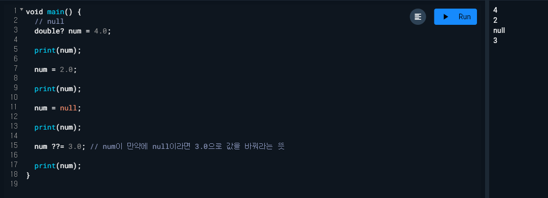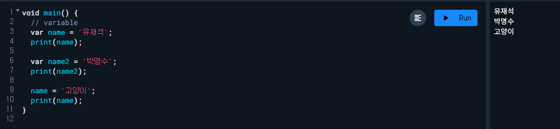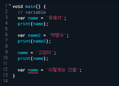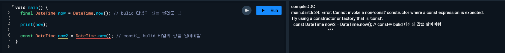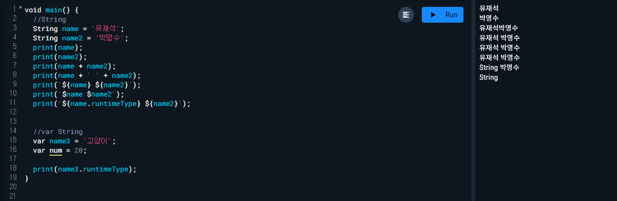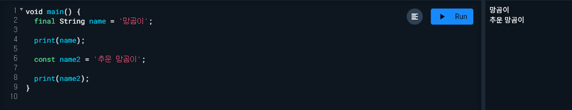 - final과 const에는 var기능을 같이 해서 타입 생략이 가능하다.